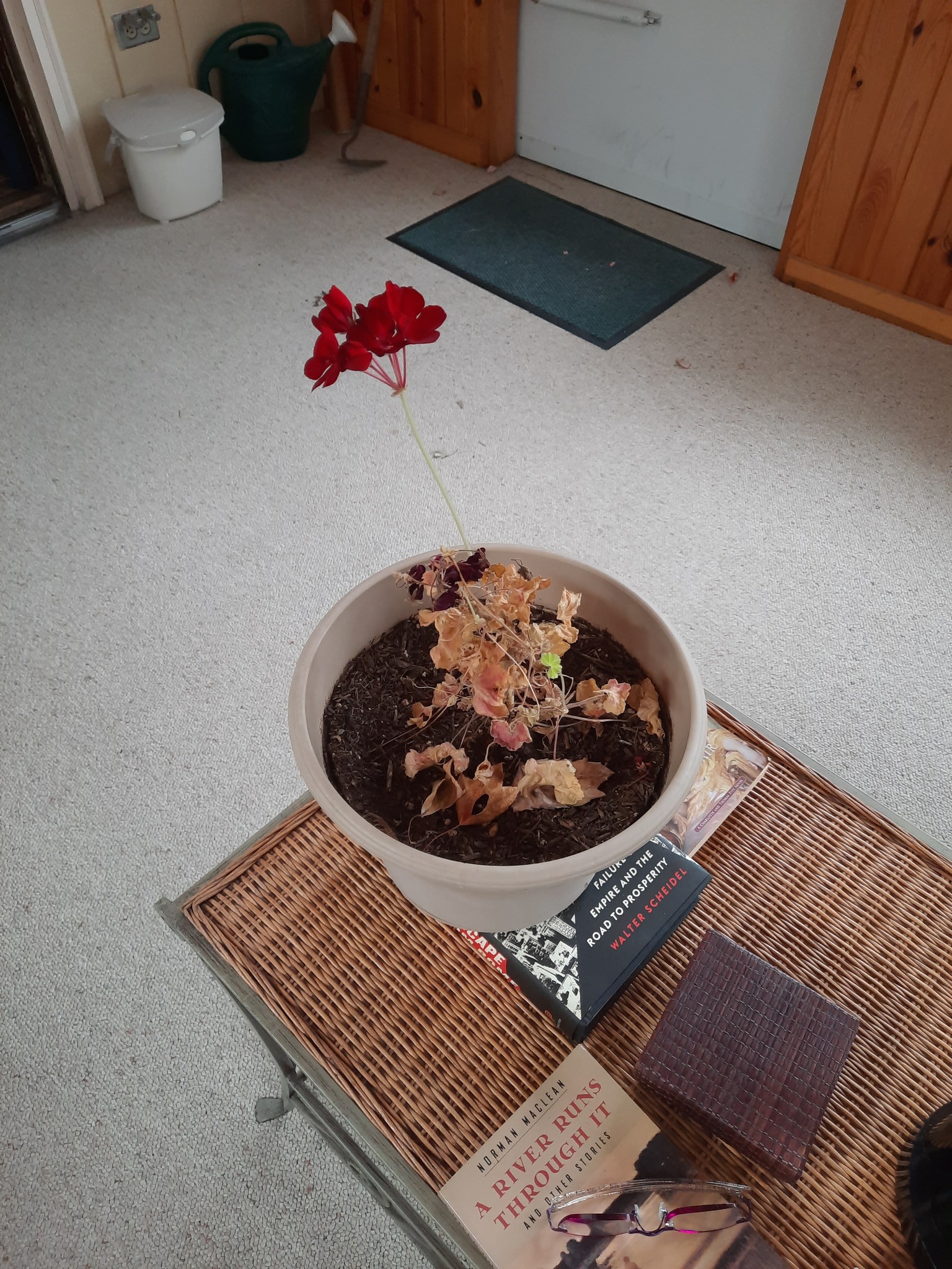 At the end of the day I got that finding, I looked over, and the geranium was blooming; the geranium we took off the porch two months ago and ignored was blooming. Amazing.